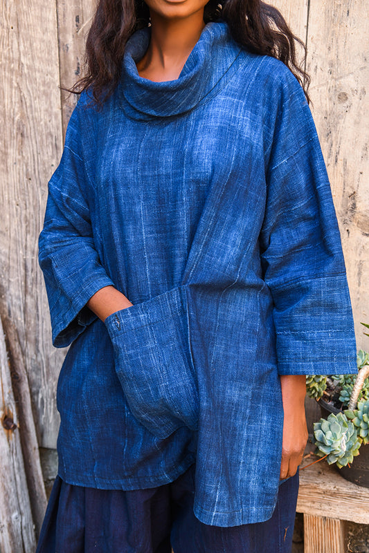 Solid Blue Indigo Cotton Fabric Tunic, African Mudcloth Textile