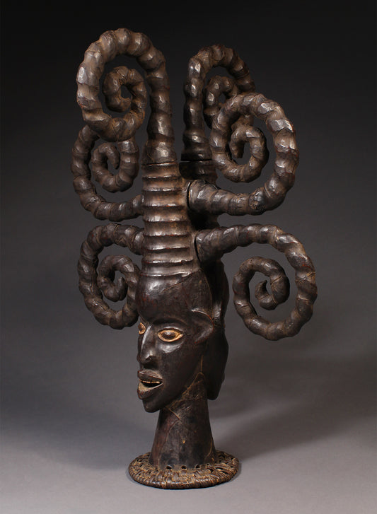 Janus Crest Mask with elaborate coiffure, Wooden Crafted, Ejagham, Ekoi Tribe, Nigeria